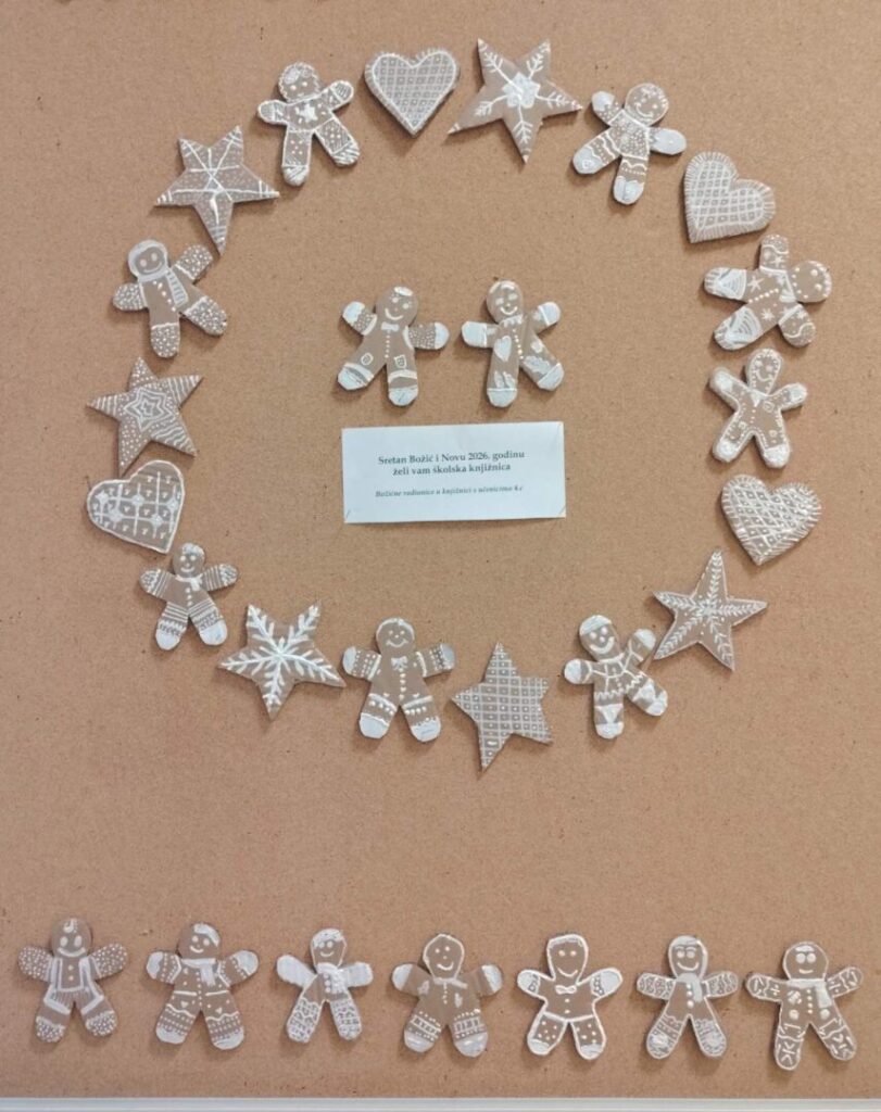 Učenici 4.c imali su božićnu radionicu u suradnji s knjižničarkom Irenom Bando i učiteljicom informatike Anamarijom Buzgo. Prvo su istraživali na internetu o običajima trajnih kolača “đinđera” (gingerbread), o njihovoj simbolici i izgledu. Zatim su izrađivali đinđere od kartona te ih ukrašavali konturnom pastom, stvarajući izgled pravih, ukrašenih gingerbread kolačića.