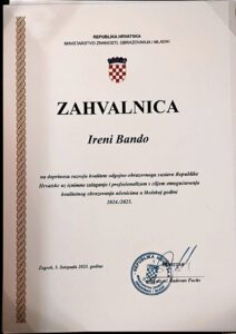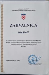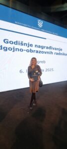 Ova priznanja dodjeljuju se u cilju prepoznavanja i nagrađivanja izuzetnog doprinosa odgojno-obrazovnom sustavu Republike Hrvatske. Osim što nagrađuju profesionalnost i predanost, ističu i značaj odgojno –obrazovnih djelatnika u odgoju i obrazovanju djece i mladih. Ove školske godine, nagradu su dobile naše djelatnice stručna suradnica knjižničarka Irena Bando i učiteljica engleskog i njemačkog jezika Iris Zorić. Proglašenje nagrađenih održalo se na svečanoj ceremoniji u Kongresnoj dvorani Zagrebačkog velesajma, 6. listopada 2025. godine povodom Dana učitelja.