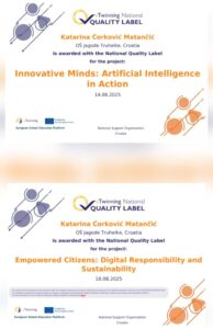 Učiteljica engleskog i njemačkog jezika Katarina Ćorković Matančić, prof., učitelj savjetnik zajedno sa svojim bivšim učenicima osmih razreda i sadašnjim učenicima sedmih razreda osvojila je eTwinning Nacionalne oznake kvalitete (National Quality Label) za sudjelovanje u projektima Empowered Citizens: Digital Responsibility and Sustainability i Innovative Minds: Artificial Intelligence in Action.