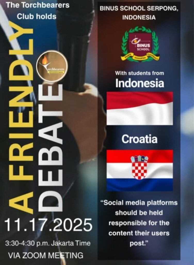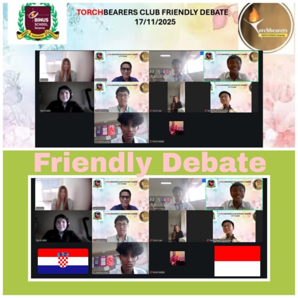 Na inicijativu svoje učiteljice engleskog jezika Iris Zorić, 17.11.2025., 4 učenika 8.razreda naše škole: Ana Čulić(8.c), Patrik Leško(8.b), Nevia Matijak(8.c) i Zoe Marie Thellman(8.c) sudjelovali su u prijateljskoj online debati s Međunarodnom Cambridge školom iz Indonezije Binus Serpong koja svake godine organizira međunarodna natjecanja u debati i javnom govorništvu. Profesor engleskog jezika Leo Veridiano porijeklom s Filipina organizirao je dio svojih učenika da budu voditelji ove debate, a dio je sudjelovao u samoj debati.