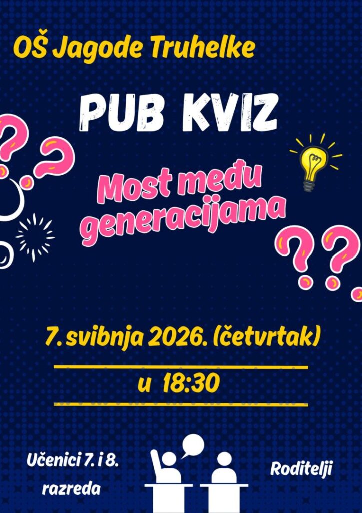 S veseljem najavljujemo da i ove godine u našoj školi organiziramo pub kviz Most među generacijama. Kviz će se održati u četvrtak 7. svibnja 2026. s početkom u 18:30 sati u školskom holu. Sudjelovati mogu učenici 7. i 8. razreda i njihovi roditelji u četveročlanim ili peteročlanim ekipama (miješane ekipe nisu dopuštene!), a koji će pokazati znanje (i sjećanje!) iz različitih područja. Najuspješnije ekipe bit će prigodno nagrađene.