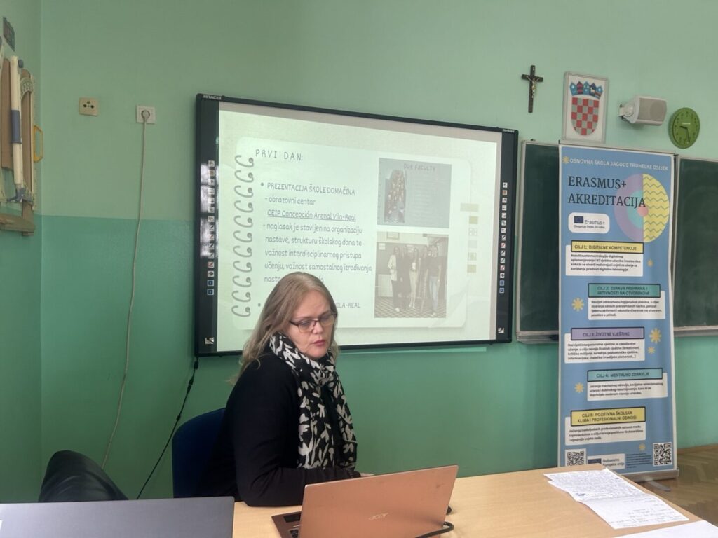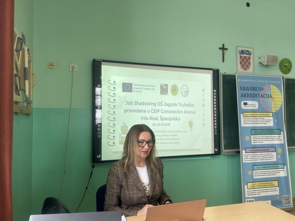 Job shadowing mobilnost u školi CEIP Concepción Arenal u Vila-realu u Španjolskoj, održanu od 20. do 24. listopada 2025. godine, predstavile su Irena Bando, Anamarija Buzgo, Vesna Ovničević i Ana Vukojević. Program je obuhvaćao praćenje nastave, sudjelovanje u radionicama, razmjenu iskustava te upoznavanje kulture i rada škole. Posebno su istaknuti fleksibilni pristupi učenju, boravak na otvorenom, metoda learning stations, suradničko učenje i razvoj životnih vještina. Tijekom mobilnosti posjećen je i centar za inkluziju, gdje su sudionici kroz iskustvene aktivnosti razvijali empatiju i razumijevanje izazova osoba s posebnim potrebama.