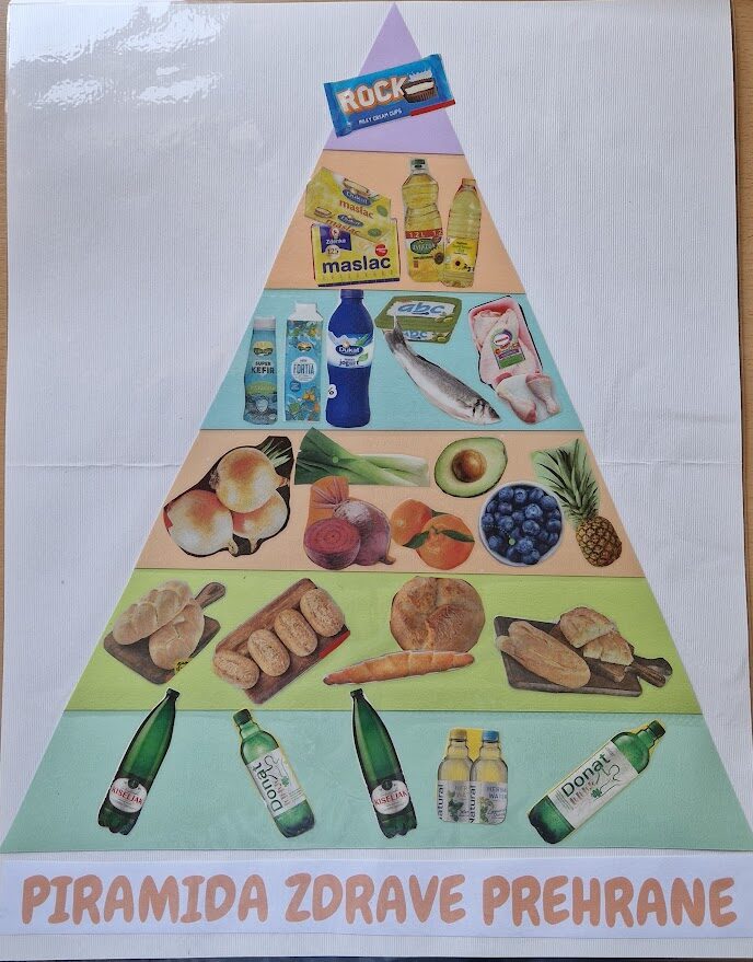 1. Piramida pravilne prehrane – izrada od namirnica iz reklamnih letaka Učenici su se najprije, na satima prirode, upoznali s pojmom piramide pravilne prehrane te su razgovarali o tome koje skupine namirnica postoje i zašto je važno unositi raznoliku hranu. Nakon uvodnog razgovora i objašnjenja, učenici su od reklamnih letaka iz trgovina izrezivali slike različitih namirnica. Zadatak je bio razvrstati namirnice prema skupinama i posložiti ih u piramidu pravilne prehrane. Tijekom aktivnosti učenici su: prepoznavali i imenovali različite namirnice, razvrstavali ih prema skupinama, proučavali hranjive tvari i njihovu ulogu u organizmu: