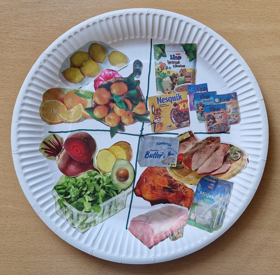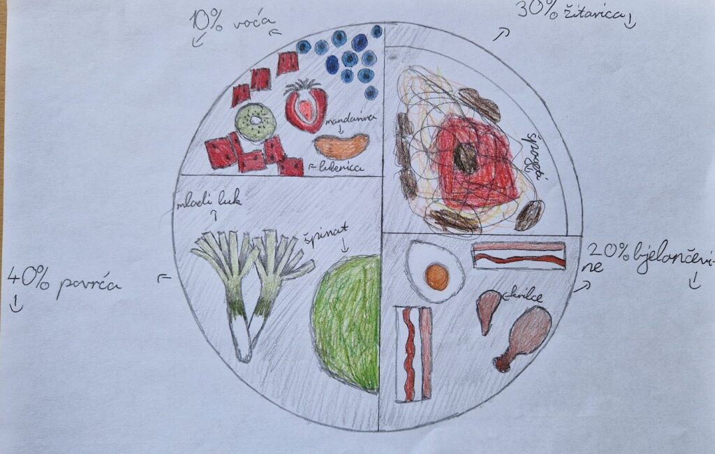 2. Zdravi tanjur – planiranje uravnoteženog obroka Sljedeća aktivnost odnosila se na koncept zdravog tanjura, odnosno pravilnog rasporeda hrane u jednom obroku. Učenici su najprije razgovarali o tome: što čini uravnotežen obrok; koje namirnice trebaju zauzimati najveći dio tanjura; zašto je važno kombinirati različite skupine hrane. Nakon toga učenici su dobili zadatak nacrtati svoj zdravi tanjur, a zatim su izrađivali tanjur i od papirnatih tanjura i izrezaka iz reklamnih letaka. Na taj su način učenici: vizualizirali raspored hrane, učili kako sastaviti zdrav i uravnotežen obrok, razvijali kreativnost i preciznost u radu.