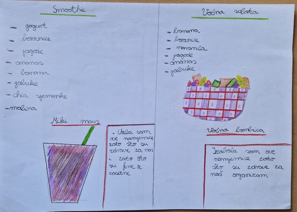 3. Pisanje recepata za smoothie i voćnu salatu Kako bi učenici primijenili stečeno znanje o zdravoj prehrani, dobili su zadatak osmisliti vlastite recepte za smoothie i voćnu salatu. Učenici su: birali različite vrste voća; razmišljali o kombinacijama okusa, zapisivali sastojke i postupak pripreme. Ova aktivnost razvijala je: kreativno razmišljanje, sposobnost planiranja jednostavnog recepta, razumijevanje kako se zdrave namirnice mogu kombinirati u ukusne obroke.