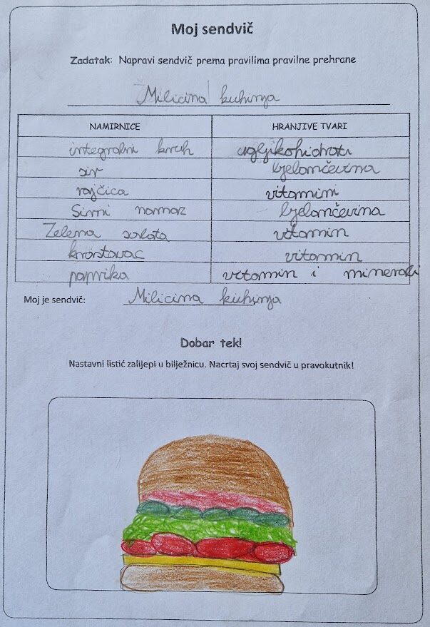 4. Moj sendvič – osmišljavanje zdravog školskog sendviča Učenici su zatim osmislili svoj zdravi školski sendvič. Zadatak je uključivao: osmišljavanje sastojaka sendviča; crtanje sendviča; smišljanje naziva za svoj sendvič; zapisivanje jednostavnog recepta. U ovoj aktivnosti učenici su primjenjivali znanje o uravnoteženoj prehrani i razmišljali o tome što bi bilo dobro ponijeti u školu kao zdrav obrok.