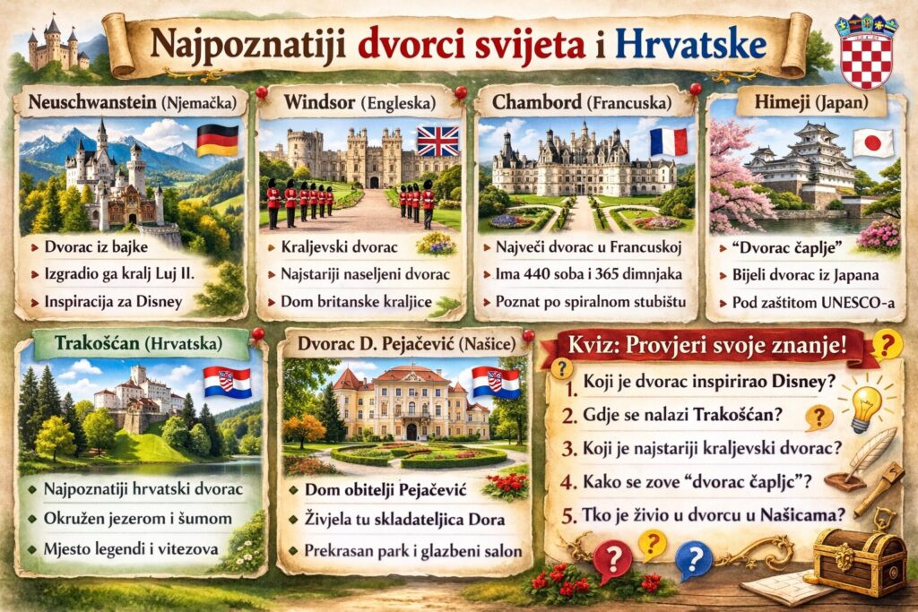 Kroz obradu sadržaja učenici su saznali kako su dvorci imali visoke zidine, kule i često skrivene hodnike, kako su služili za zaštitu, ali i za pokazivanje moći i bogatstva. Upoznali su se i s prostorijama u dvorcima, životom stanovnika te svakodnevnim aktivnostima koje su se ondje odvijale. Kako bi provjerili usvojeno znanje, učenici su sudjelovali u kvizu. Neka od pitanja bila su: