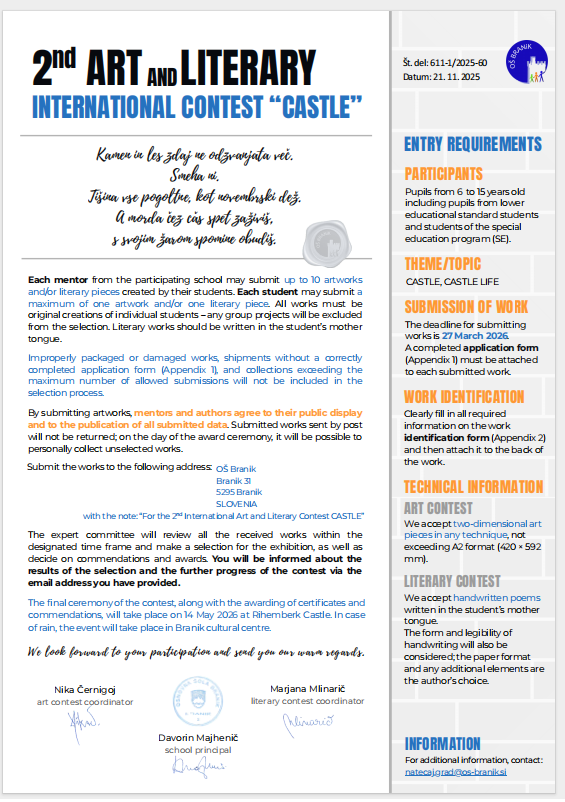 Natječaj je organizirala Osnovna škola Branik iz Slovenije, a bio je namijenjen učenicima od 6 do 15 godina. Tema natječaja bila je „Dvorac i život u dvorcu“, s ciljem poticanja kreativnosti, istraživanja kulturne baštine i izražavanja kroz likovni i literarni rad.