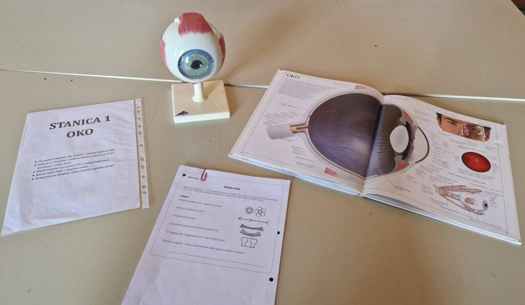 Blok sat biologije na temu osjetila vida i sluha, u 8.a, b, i c razredu s nastavnicom Vesnom Ovničević, realiziran je metodom učenja po stanicama s ciljem ponavljanja, utvrđivanja i produbljivanja prethodno obrađenog gradiva. Ovakav oblik rada omogućuje aktivno sudjelovanje svih učenika, razvoj suradničkog učenja te primjenu znanja kroz različite tipove zadataka (model, pisani zadaci, iskustvene aktivnosti).