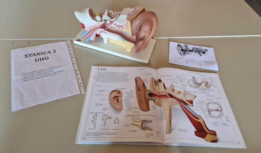 Na ovoj stanici učenici su ponavljali građu uha uz model te ispunjavali tablicu o dijelovima i njihovim funkcijama. Većina učenika uspješno je razlikovala vanjsko, srednje i unutarnje uho.