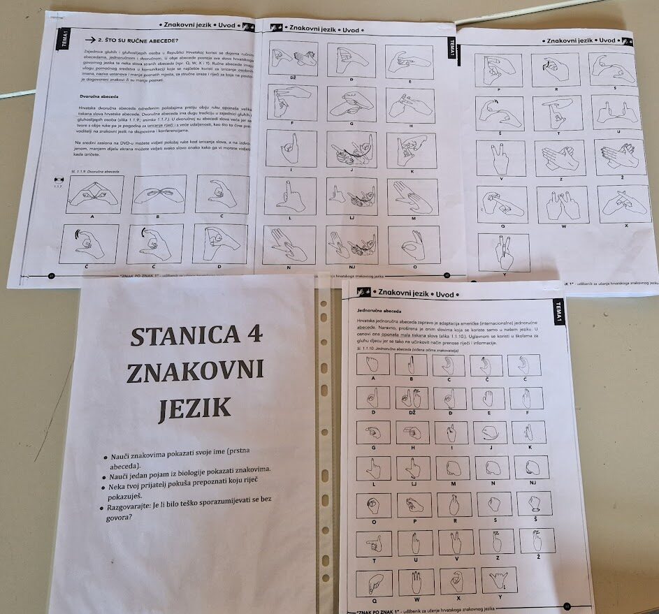 Na ovoj stanici učenici su učili pokazati svoje ime prstnom abecedom te jedan pojam iz biologije. Aktivnost je bila vrlo dinamična i motivirajuća. Učenici su s velikim zanimanjem pokušavali „pročitati“ riječi koje su im prijatelji pokazivali.
